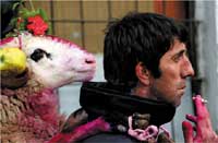 مواطن بلغاري يحمل على ظهره خروفاً وضعت فوق رأسه باقة زهور لتقديمه هدية لعروسين خلال حفل زفافهما في إحدى القرى البلغارية. وتتم خلال الشتاء مراسم زواج غير تقليدية في قرية البين التي تبعد 210 كم عن العاصمة صوفيا. (رويترز)........