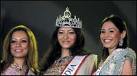 جيمي ناندا (الوسط) الفائزة بلقب ملكة جمال الهند لعام 2007م وبجانبها الوصيفة الأولى (يمين) والثانية خلال الحفل الذي أقيم في مدينة بومباي العاصمة التجارية للهند. ( رويترز)........