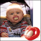 * يسمونها اللهَاية أو العضاضة لكنها اليوم أصبح هدفها أكبر من مجرد إسكات الرضيع وتهدئته. فبإمكانك أن تحول طفلك إلى مهرج صغير وسيظهر بشكل مثير للضحك في كل مرة يضع هذه العضاضة بين فكيه، وتذكر أنك حين تضحك فسيضحك طفلك معك وسيستمتع هو بوجودها كما تستمتع أنت وبقية أفراد العائلة بمشاهدتها عليه. ويبقى أن تعرف أنها آمنة ولا تحتوي على قطع قد تتفكك وتسبب الأذى لطفلك الصغير.