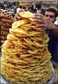 حلوى رمضان الشهيرة في العاصمة بغداد يعرضها أحد البائعين لإغراء الصائمين للشراء