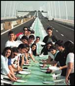 فريق عمل بإحدى شركات تقديم الأطعمة على وشك الانتهاء من إعداد مأدبة غداء تتسع لحوالي 000 ،15 شخص وذلك بالقرب من اطول جسر في اوربا، الذي يقع في مدينة لشبونة البرتغالية.