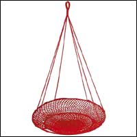 * كرسي لكنه على شكل أرجوحة تتأرجح في الهواء الطلق مصنوع من خيوط النايلون التي أخذت شكل حبال وشبك دائرية الشكل.