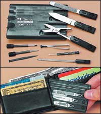 * بإمكانك الآن أن تحمل عشر أدوات في محفظتك، فصندوق الأدوات الصغير والقليل السمك هذا هو بحجم بطاقة الأعمال، لكنه يضم مقصات وفتاحة رسائل ومبرد أظافر ومفكين وقلماً وإبرة خياطة وأداة إدخال الخيط في الإبرة وملقطاً للشعر وعصيا لتنظيف الأسنان ومسطرة. ويتم وضع كل أداة داخل الكيس المصنوع من البلاستيك المتين. كذلك فإنه ........