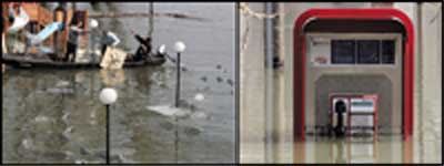 صورتان التقطتا بالقرب من نهر سافا في بلغراد حيث تغطي المياه كابينة الهاتف العمومية ومطعم على شاطئ النهر بعد ان ذابت الثلوج مع بدء أيام الربيع هناك (رويترز)........