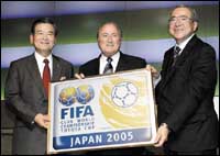 كاميرا هذا الأسبوع التقطت هذه الصورة التي يظهر فيها رئيس الأتحاد الدولي لكرة القدم «وسط» وعضو الفيفا التنقيذي السيد جونى أوكورا «يمين» ورئيس الأتحاد الياباني لكرة القدم السيد سابورو كاوابوتشي «يسار» أثناء تدشينهم الشعار الرسمى الخاص بكأس تويوتا العالمي للأندية والتي سيقام في اليابان وتتنافس عليه ستة أندية من ست قارات.........