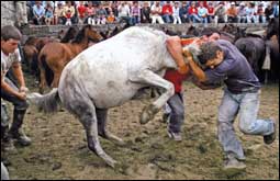ثلاثة شبان إسبان يحاولون كبح جماح حصان خلال احتفال تقليدي يقام سنوياً في قرية سابوسيدو بشمال غرب إسبانيا ويشارك فيه المئات من الأحصنة البرية. (رويترز)........