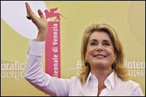 نجمة السينما الفرنسية كاترين دونوف رئيسة لجنة التحكيم في مهرجان فينيسيا السينمائي الذي اختتم فعالياته مؤخراً، تحيي الجمهور الإيطالي الذي استقبلها بحفاوة بالغة. ( أ.ف.ب)........