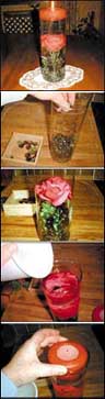 في هذا العمل اليدوي تختلط مواد الطبيعة مع مواد الإنارة لتشكل منظراً رومانسياً خلاباً، مصدره الشمعة المنارة فوق زهرة حمراء جميلة.