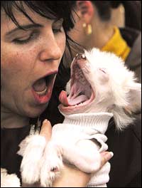 * كلب يتثاءب وتقلده مربيته في عرض للكلاب في مدينة مينسك ببيلاروسيا