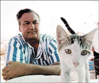 أحد الناجين من الإعصار الذي ضرب جنوب الولايات المتحدة ينظر إلى قطة قام بإنقاذها وأطلق عليها اسم «كاترينا». (أ.ف.ب)........
