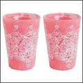 * إناءان مصنوعان من السيراميك الأنيق بمظهره الخارجي حيث اللون الزهري غطى كامل الإناء المستخدم لاحتواء الشمع الذي ينير المائدة في غرفة الطعام.