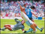 ففي مباراة الأرجنتين وإنجلترا في نهائيات كأس العالم 1986م وبعد دقائق معدودة من إحرازه الهدف الأسطوري بيده استلم مارادونا كرة في منتصف الملعب وبحركة بارعة استطاع التخلص من لاعبين إنجليزيين ومن ثم انطلق باتجاه المرمى ........