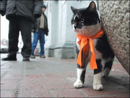 قط يلبس في رقبته شريطاً برتقالي اللون رمز مرشح حزب المعارضة في أوكرانيا فيكتور يوششنكو. (رويترز)........