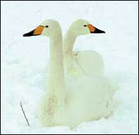 أوزتان في حديقة حيوان سانت بطرسبرج في بركة مائية تحولت إلى ثلج امتزج بياضه مع بياض الأوزتين ليشكل لوحة إبداعية غاية في الروعة. (أ.ف.ب)........