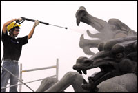 عامل تنظيف يقوم بتنظيف تمثال على هيئة تنين قبيل الاحتفالات بأعياد الربيع في الصين. ( رويترز)