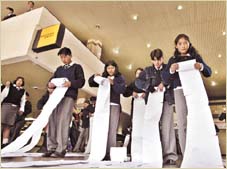 طلبة وطالبات ثانوي بوليفيون خلال إعدادهم رسالة طولها 20 كيلومتراً ليتم إرسالها إلى الأمين العام للأمم المتحدة كوفي عنان من أحد مكاتب البريد في العاصمة البوليفية لاباز. وتطالب تلك الرسالة الأمين العام لمساعدة بوليفيا على استرداد جزء من سواحلها التي استولت عليها تشيلي خلال حرب الباسيفيك قبل 125 عاماً. (الصورة من رويترز)........