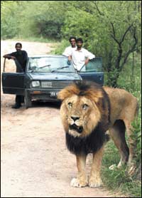 شباب باكستانيون ينظرون إلى أسد يقف على الطريق داخل أحد السفاري في بلدة روالبندي بباكستان. (أ.ف.ب)........