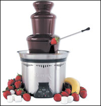 * نافورة الشيكولا للحفلات والمناسبات السارة. تعمل بقوة موتور صغير لا تكاد تسمع له صوتاً. توضع على المائدة حيث تصب الشيكولا في قاعدة تماماً مثل النوافير العادية بحيث يمكن التناول منها أثناء تناول الحلويات على المائدة كنهر من الشيكولا يتدفق على المائدة.