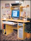 * حتى لو كان لديك فراغ كبير في المنزل فلا حاجة بك لشغل مساحة كبيرة منه لوضع مكتب للكمبيوتر. فهذا المكتب سيكون نافعاً للجميع سواء كانوا يفتقرون المساحة اللازمة لوضع مكاتبهم أو كان لديهم مساحة كافية. فالجزء العلوي يوفر مساحة لوضع شاشة الكمبيوتر ولوحة المفاتيح مع وجود أماكن على الجوانب لحفظ 18 قرصاً من الأقراص المضغوطة مع أدلة تشغيل ملحقات الكومبيوتر وما شابه ذلك. ويوجد أسفل سطح المكتب رفاً منزلقاً للوحة المفاتيح وخمسة رفوف (ثلاثة منها قابلة لتعديل الارتفاع) إضافة إلى رف طويل للطابعة.