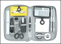 * يمكنك أن تحمل هذه العدة المكتبية أينما ذهبت دون أن تضطر لشراء أي منها على انفراد. وهي تشمل إحدى عشرة أداة أساسية مكتبية. فهناك المسطرة وقاطعة الصناديق والمقصات وماسكة بطاقات الأعمال وكابسة الورق ومزيلة كبس الورق وورق الملاحظات وقلم الرصاص مع لب احتياطي وممحاة وقلم جاف مع حاسبة رقمية بغلاف من الحديد المقاوم للصدأ والبلاستك ........