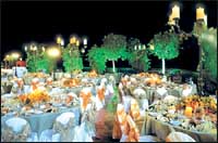 والديكورات يشرف على تصميمها خبراء أجانب، وتعزف الموسيقى، وتنظر إلى سماء المكان فترى عجباً، فالعروسان يهبطان من السقف إلى الصالة.