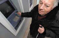 فرنسي كفيف يستخدم بطاقة صراف للسحب من ماكينة ATM تم تجهيزها خصيصاً للاستخدام من قبل المحرومين جزئياً أو كلياً من نعمة البصر. وقد تم إنتاج ماكينتين منها في فرنسا لهذا الغرض.