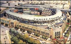 صورة للتصميم الجديد لاستاد فريق «نيويورك يانكيز» الذي أعلن عنه في مؤتمر صحافي في 15 يونيو 2005. وسيتكلف بناؤه 800 مليون دولار وقد روعي في التصميم المحافظة على عدة أجزاء من الاستاد القديم ذات الطابع التراثي.........