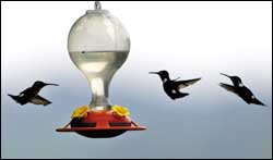 ثلاثة عصافير من النوع الطنان تطير بالقرب من إناء يحتوي على غذاء عصافير في مدينة مانيزاليس بغرب كولومبيا. ويعيش في هذا البلد أكبر تنوع للعصافير الطنانة في العالم. (رويترز)........