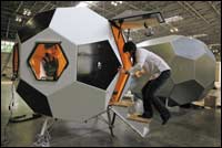 * امرأة تدخل نموذجاً لمنزل على هيئة كرة قدم في مدينة ناغويا اليابانية غرب طوكيو بمناسبة انعقاد مؤتمر عن الإسكان بالمدينة. المنزل مقاوم للزلازل ويطفو في الماء، ويبلغ سعره 629،12 دولاراً.