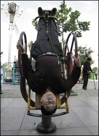 * صيني يقف على رأسه أثناء أدائه بعض التمارين في قرية نانجي بوسط الصين. تعد هذه القرية من بقايا نظام ماو الشيوعي، حيث تسود مبادىء الجماعية والانضباط ويحصل السكان على مزايا مجانية في السكن والرعاية الصحية والتعليم والغذاء.