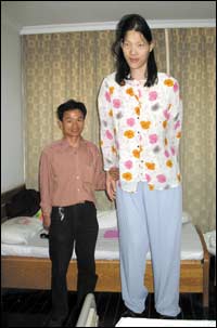 *ياو ديفين (إلى اليمين)، أطول امرأة في آسيا تقف بجانب شقيقها لإجراء فحص طبي في مدينة هيفي الصينية. تعاني ياو، البالغة 34 عاماً، مؤخراً من بعض المتاعب الصحية التي أجبرتها على لزوم فراشها.