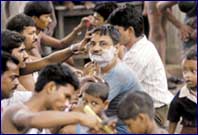 * عدد من الحلاقين يقومون بعملهم في أحد شوارع مدينة كالكتا، وتقول التقارير إن هناك احتمال نقل فيروس الإيدز لزبائن هؤلاء الحلاقين لعدم اتخاذهم وسائل النظافة المطلوبة. (أ.ف.ب)........
