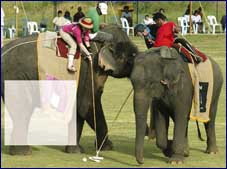 * لاعبو بولو تايلنديون يجلسون على ظهري فيلين خلال مباراة بولو استعراضية في إطار كأس ملك تايلند السنوي الثالث لبولو الأفيال والتي جرت في بلدة «هواهن» التايلندية. (أ.ف.ب)........
