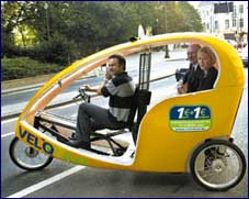 * السويدي مارجوت والستردم، المفوض الأوروبي لشؤون البيئة وبجانبه نائبة رئيس المفوضية الأوروبية للإصلاح الإداري يغادران المقر الرئيسي للسوق الأوروبية في مدينة بروكسل على متن تاكسي دراجة. (أ.ف.ب)........