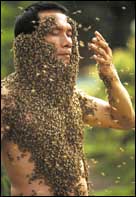* الصيني شن شانجزد يعرض قدرته على اجتذاب النحل للإلتفاف بجسده بعد قيامه بوضع نحلة ملكة أسفل فكه. (أ.ف.ب)........