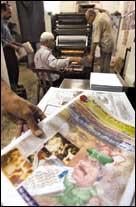 * عمال عراقيون يعملون على طباعة عدد من صحيفة «حابس بوز» الأسبوعية الساخرة. وقد بلغ عدد الصحف التي تصدر في العراق حالياً 160 صحيفة. (أ.ف.ب)........