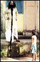 الهندي شيبسانكرا بهاراتي يقف متباهيا امام منزله بلحيته التي يبلغ طولها 80 بوصة بينما ينظر إليه أحد الأطفال في فضول ويزعم بهاراتي الذي يعيش في ولاية كلكتا الهندية ولم يحلق ذقنه منذ عشرين عاما يزعم انه صاحب أطول لحية في العالم ويعتزم التقدم الى موسوعة غينيس للأرقام القياسية لتسجيل اسمه بها.........