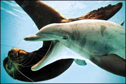 وصرح موظفو الحديقة أن الجمع بين الدلفين وأسد البحر في حوض واحد يؤدي إلى ظهور سلوك اجتماعي فريد من نوعه بين الاثنين وكأنهما من نفس الفصيلة. (أ.ف.ب)........