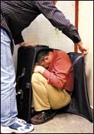 حيث يقومون بحشر أنفسهم في حقائب مقابل 300 دولار يتم دفعها لحامل الحقيبة. (أ.ف.ب)........