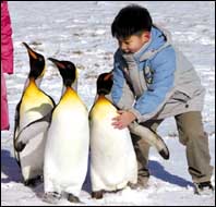 * طفل كوري جنوبي يلعب مع عدد من طيور البطريق على ضفة أحد الأنهار المتجمدة.