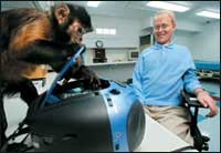 القردة «أيلا» البالغة من العمر 10 سنوات تقوم بإخراج اسطوانة مدمجة من جهاز تسجيل لشاب معاق بمركز لتأهيل المعاقين بولاية بوسطن الأمريكية. ويقوم هذا المركز بتدريب القردة على القيام ببعض المهام الضرورية لذوي الاحتياجات الخاصة. (رويترز)........