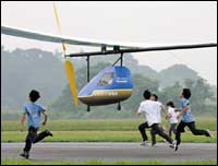 أول طائرة في العالم تعمل بالبطارية الجافة تحلق في الجو بينما يركض وراءها طلاب معهد التكنولوجيا المتطورة بطوكيو في مدينة أوكيجاوا بشمال العاصمة. ويبلغ طول هذه الطائرة المصنوعة من الألياف الكربونية 01 أمتار ووزنها 01 كلم. (أ.ف.ب)........