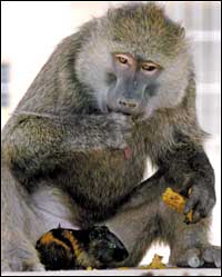 أنثى قرد من فصيلة البابون تجلس وبجانبها «هامستر» في إحدى حدائق الحيوان بفلسطين المحتلة. وقد وصل الهمستر إلى قفص هذه القردة بطريق الخطأ، إلا أنها تبنته وبدأت بالاهتمام به ولا تسمح للقردة الآخرين من الاقتراب منه. (أ.ف.ب)........