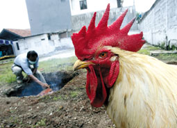مواطن يعد حفرة لحرق الدجاج ضمن حملة لمكافحة وباء انفلونزا الطيور في جاكرتا بإندونيسيا. وطلبت إندونيسيا من الجيش التدخل للمساعدة في مكافحة الوباء بعد يوم واحد من إصابة فتاة صغيرة بالمرض القاتل لتكون بذلك الضحية السادسة للمرض. ( رويترز)