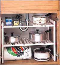 * يمكن بهذه الرفوف أن تستغل ربة البيت المنطقة الموجودة تحت مغسلة المطبخ في حفظ الكثير من الأشياء التي تحتاج إليها. فهذه الرفوف قابلة للتعديل بحيث لا تتعارض على الإطلاق مع الأنابيب الموجودة تحت مغسلة المطبخ خاصة أنها تحوي شرائح معدنية متحركة لتحقيق هذا الغرض. وهيكل الرفوف مصنوع من البلاستيك المتين وهو قابل للتوسيع من 18 إلى 30 بوصة وبعمق 12 بوصة وارتفاع 16 بوصة.