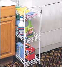 * إذا كانت الحاجة ملحة للحصول على مكان ما لحفظ العديد من مواد المطبخ فربما تكون هذه العربة ذات الرفوف هي الحل المناسب. فهي لا تأخذ الكثير من مساحة المطبخ ويمكن حشرها في الفراغ الموجود بين المغسلة ومجففة الملابس مثلاً، وهي تحتوي على ثلاثة رفوف متينة يمكن استخدامها لحفظ عبوات المنظفات وأدوات المطبخ الضرورية. وهي سهلة التجميع ومصنوعة من الحديد المغلف بالبلاستيك، أما أبعادها بالبوصة فهي 3\24\9