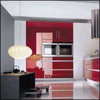 * مطبخ عصري بألوانه الحمراء وبالمقتنيات المعدنية المصنوعة من الزجاج الأنيق.