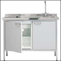 * مطبخ متكامل ومتنقل مكون من حوض غسيل وقاعدة معدنية لتحضير الطعام.
