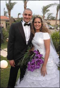 الفنان المصري أحمد الفيشاوي وعروسه أثناء زفافهما في فيلا والده فاروق الفيشاوي التي تقع خارج مدينة القاهرة. (أ.ف.ب)........