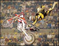المتسابق الإسباني سيدني أندريس يؤدي حركة بهلوانية خلال مسابقة للقفز الحر على الدراجات النارية أقيمت في مدينة برشلونة الإسبانية وفاز في المسابقة صاحب هذه الصورة.........